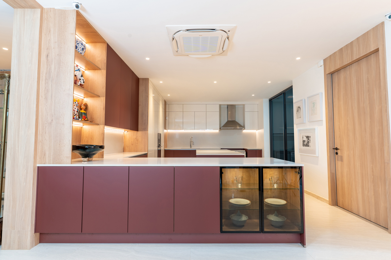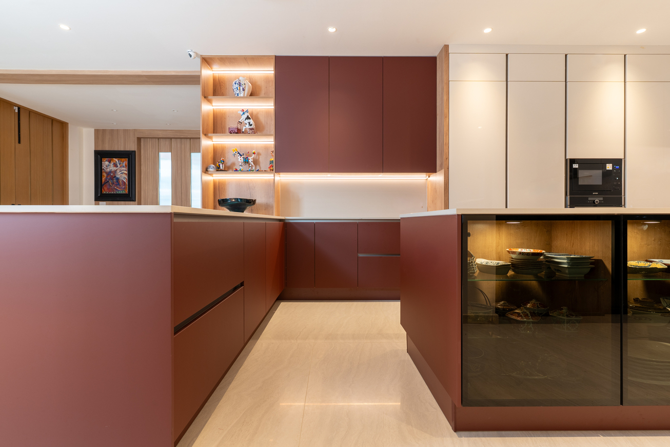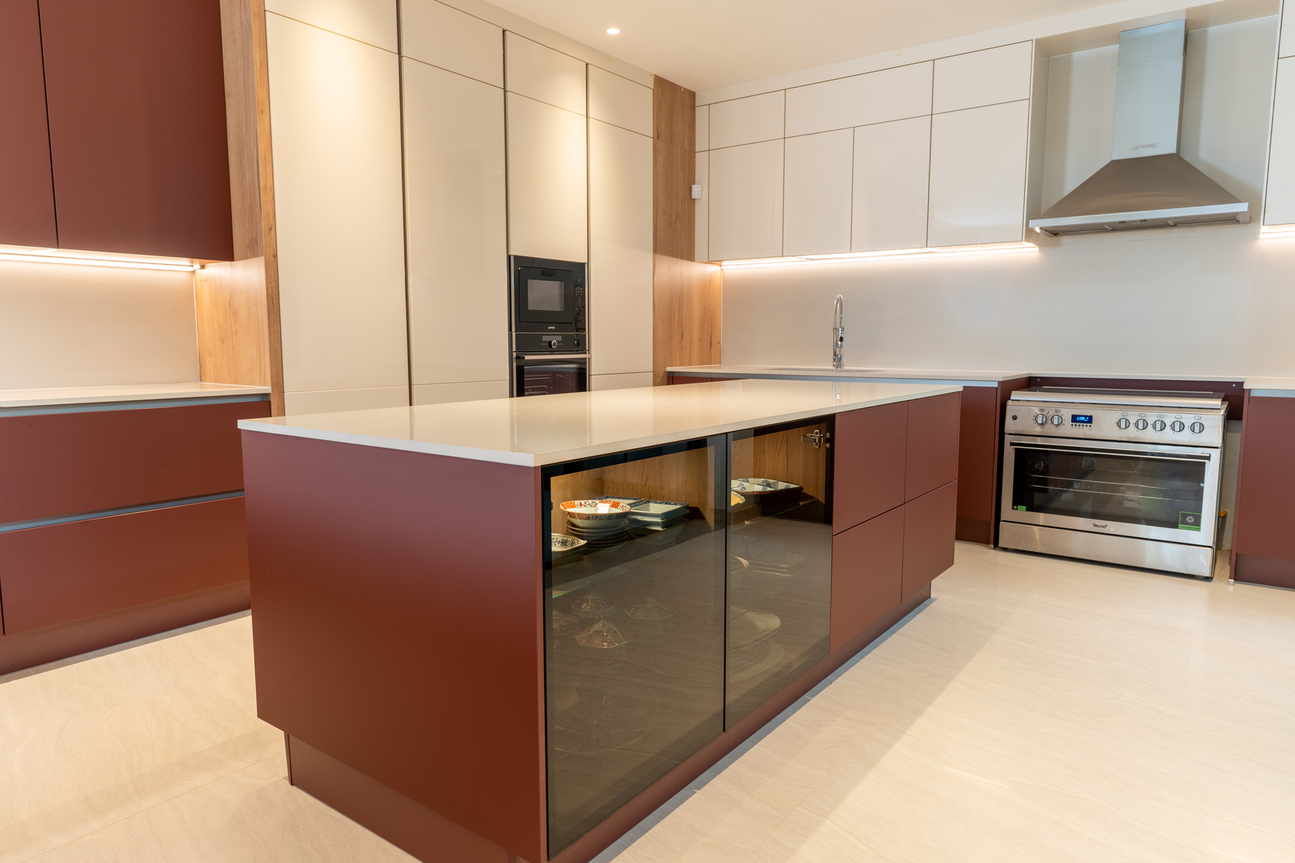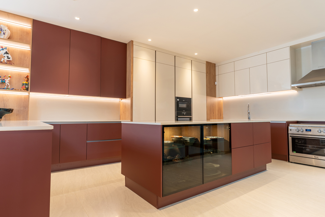 To create the desired visual impact, the design pivoted to a bold rust red finish. This choice transformed the kitchen into a deliberate accent piece that anchors the living area. To ensure the bold color did not become overpowering, German Kitchen Design recommended integrating glass cabinets and open shelving. This broke up the solid panels, adding depth, texture, and a designated space to display the client’s ceramics.