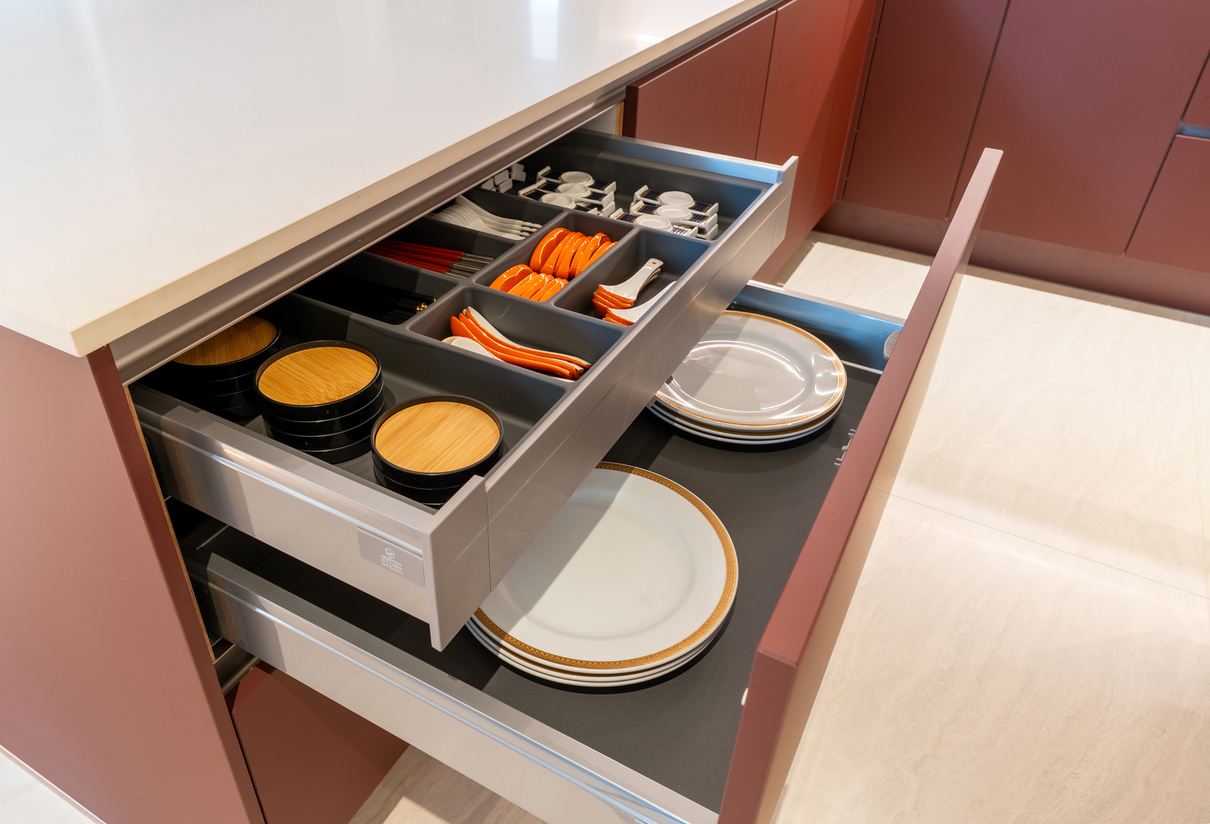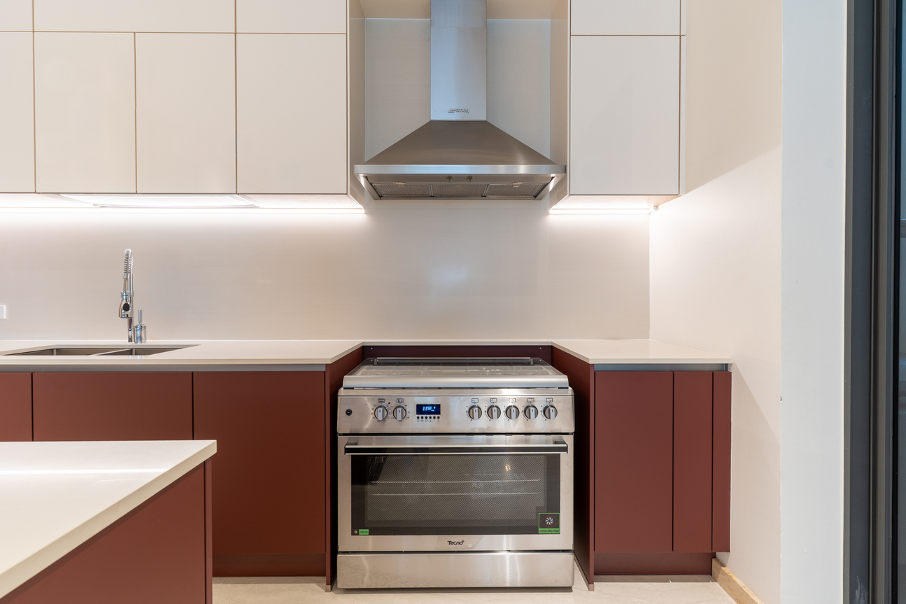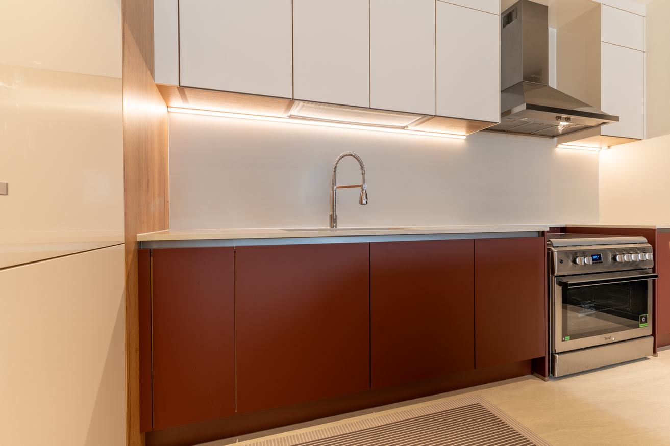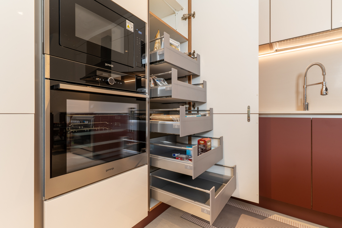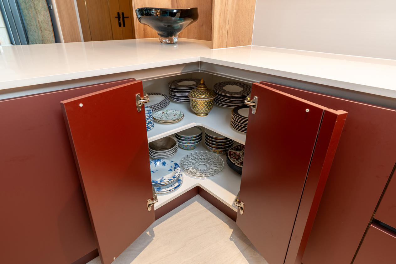 To create the desired visual impact, the design pivoted to a bold rust red finish. This choice transformed the kitchen into a deliberate accent piece that anchors the living area. To ensure the bold color did not become overpowering, German Kitchen Design recommended integrating glass cabinets and open shelving. This broke up the solid panels, adding depth, texture, and a designated space to display the client’s ceramics.