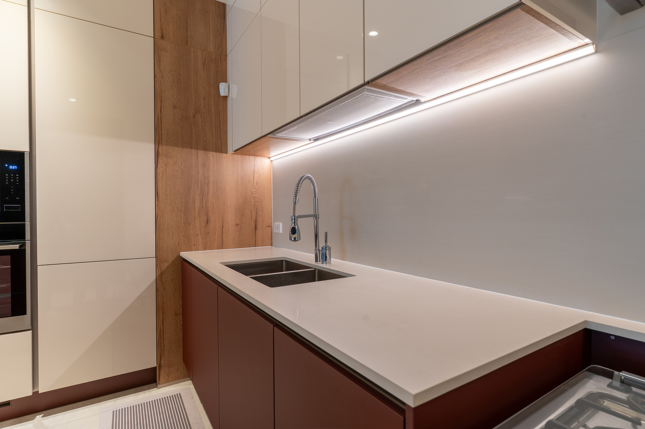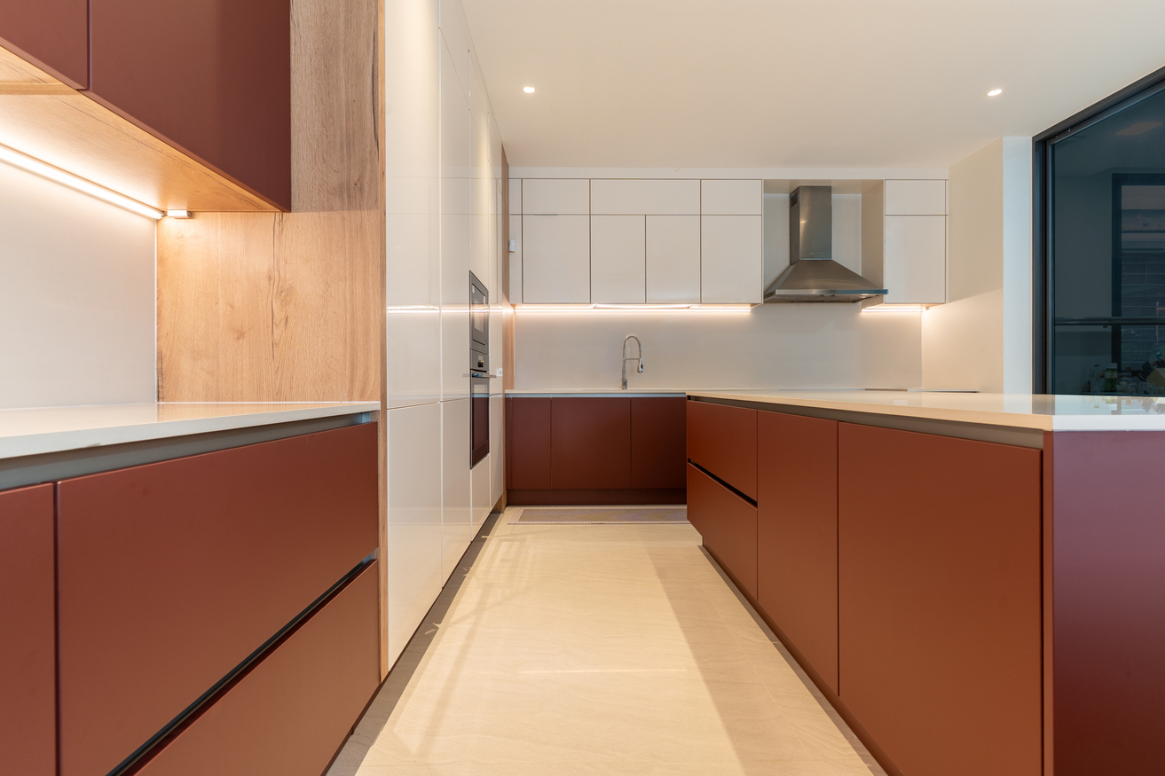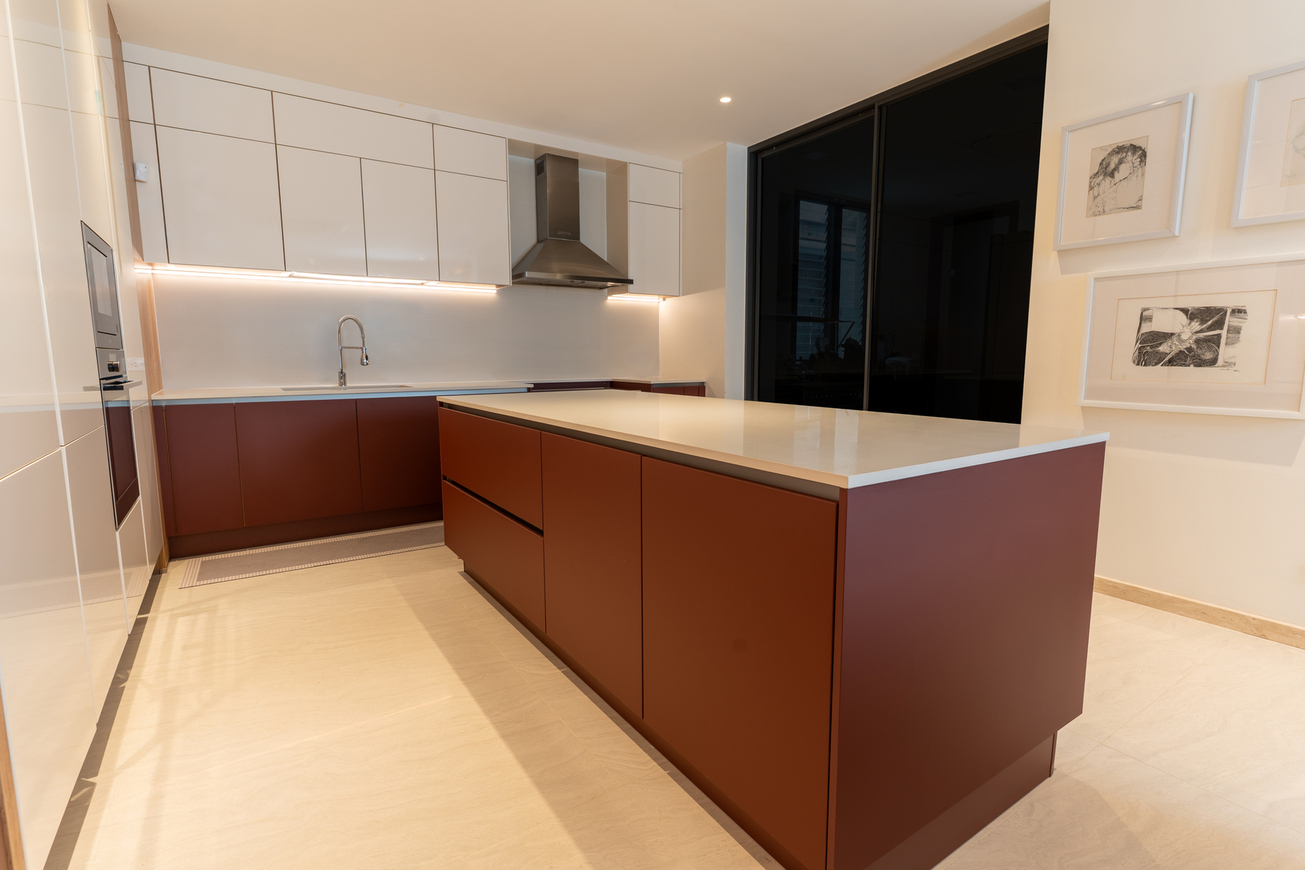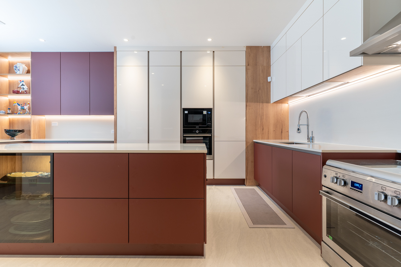 The Geoluxe Nestos Royal porcelain worktops were chosen for its durability during entertaining. The cabinetry features EASYTOUCH in rust red ultra matt, providing a sophisticated matte finish that resists fingerprints during social gatherings, paired with FLASH in ivory high gloss to add light and depth to the design.